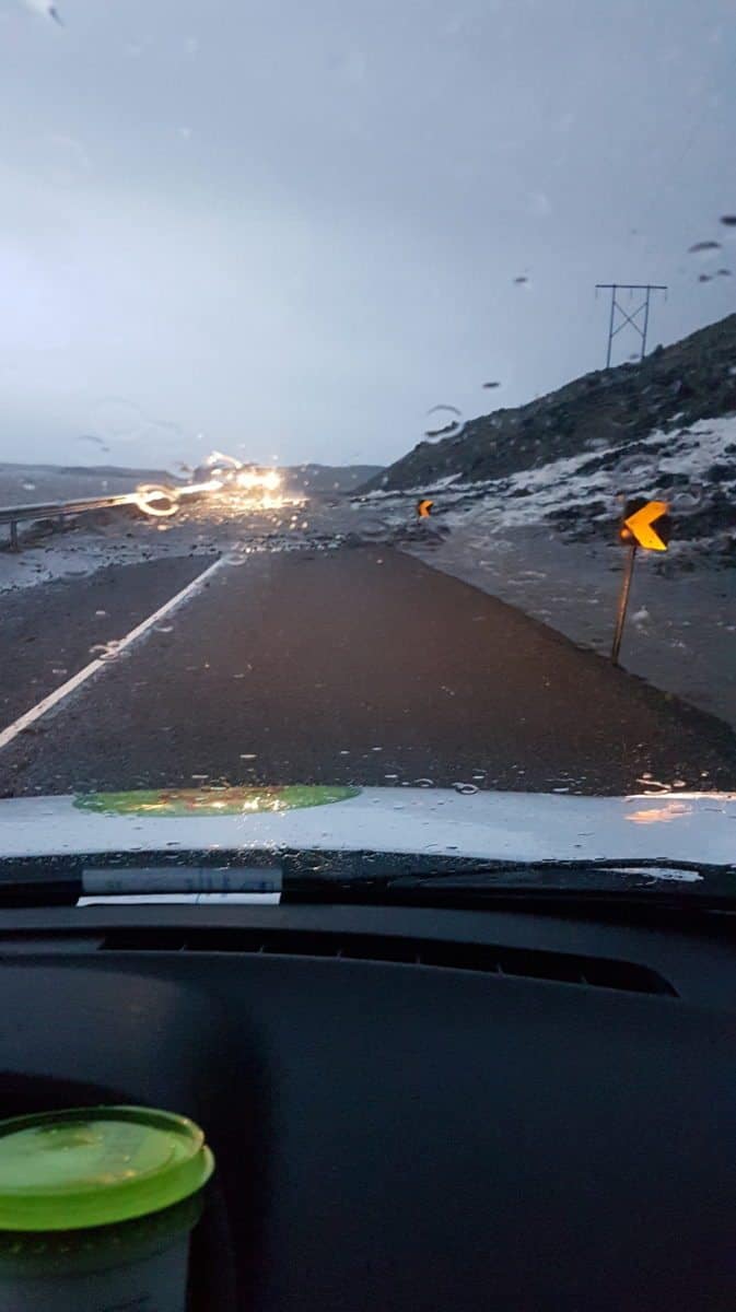 Then, even though it was dark, it was only 20:00, so we decided to drive through the east coast to save time on our itinerary, expecting to sleep in Höfn. While we were driving, it began to rain heavily, and then suddenly, we were in the thickest fog I’ve ever seen. We literally couldn’t see one meter in front of the car. We had to drive very slowly, guiding ourselves with the little reflective stick on the side of the road. Then, on top of the dark, the heavy rain, and the thick fog, intense winds hit us (afterwards we learned they were 130 km/h). We stopped at the nearest rest area and decided to sleep there for the night and stay until the storm passed. Throughout the night, the wind was so strong we felt the camper van sway from side to side. We were afraid it would fall and practically didn’t close our eyes all night, but thank god, it held on! The next morning, we left as we wanted to leave the more distance we could between us and that place. On our way to the south, we crossed multiple parts of the road that started to be flooded and had to drive right through it, hoping not to get stuck. As some point, there was even a small landslide. We managed to safely get out of there just in time, since later that day, the road between Jökulsárlón and Höfn was closed for at least 5 days due to the flooding.