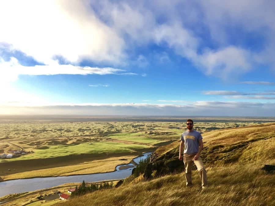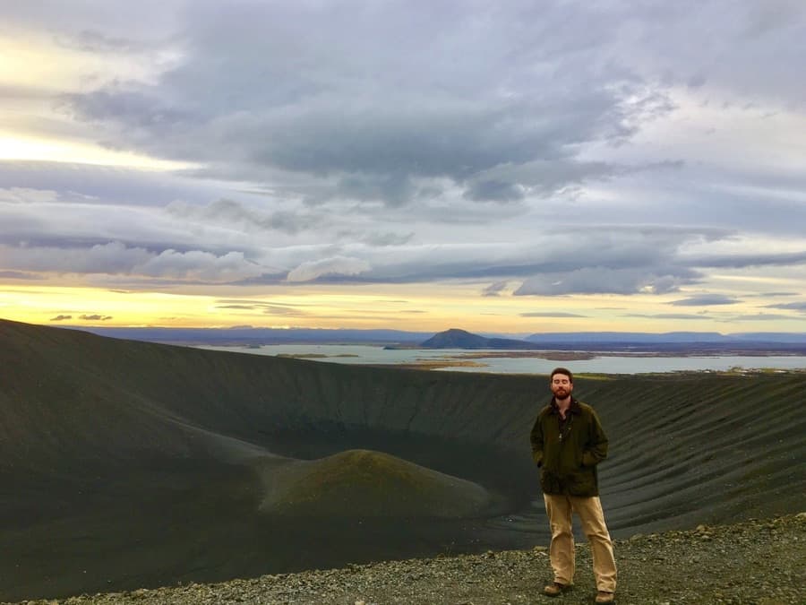 Hverir is an experience for all of your senses; seeing all the steam flowing up out of the ground, smelling the unique sulfur scent, feeling the heat, and hearing peoples ‘ooohs’ and ‘ahhhs.’ The Hverfjall crater, which we could see from the hot springs, was calling to us to explore. After hiking to the top, despite the incredibly strong winds, we knew we had to hike all the way around. The view looking across the crater while seeing the sun begin to set with it’s striking color display was quite the sight!