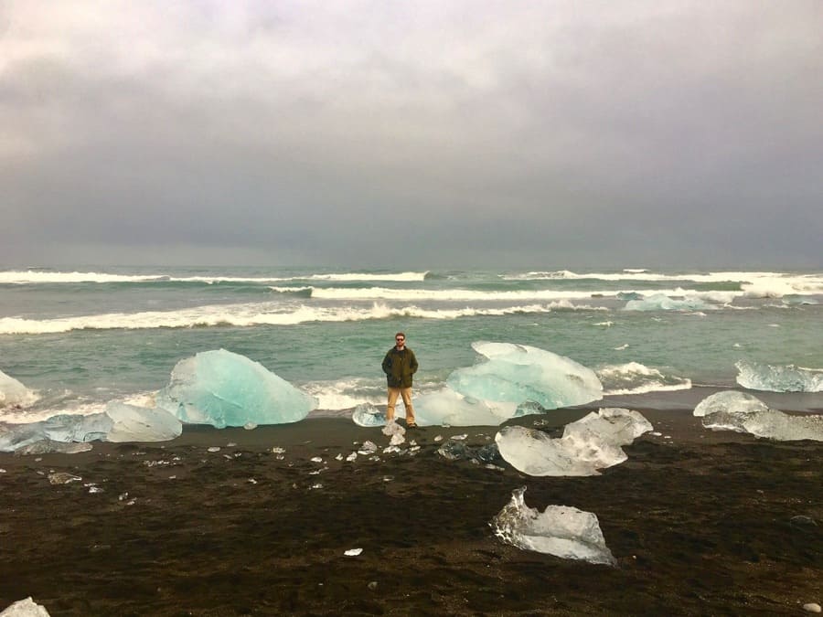 While getting our photo taken in front of the lagoon where here a strange noise and turn around to see an iceberg calving right next to us! Then a couple minutes later we saw a sea otter swimming right by. This really got some reactions out of the people nearby. What we didn’t realize was that you could also walk out to the beach right near the glacier lagoon. The beach was covered in icebergs of all different sizes. This was quite a different experience than being down in the Gulf Shores of Alabama.