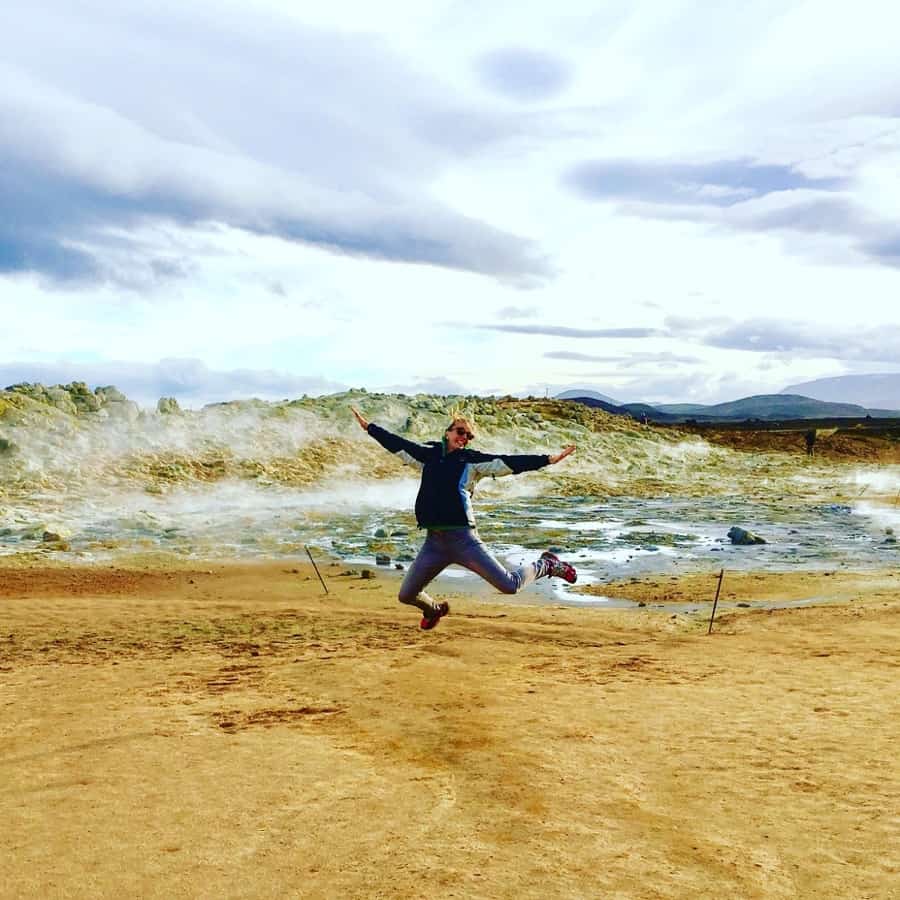 Day 2 began by wiggling out of our sleeping bags in the cozy back of our van and hopping back onto the ring road. We had been warned to be careful opening the van doors when it was windy, and boy did we have to hold on tight as we got out at Viti to explore the crater lake on Krafla volcano and the lava fields. Although we were tempted to climb to the highest point of the crater, it was so windy that we were nervous, I was nervous we would get blown into the beautiful torquise water within the crater.