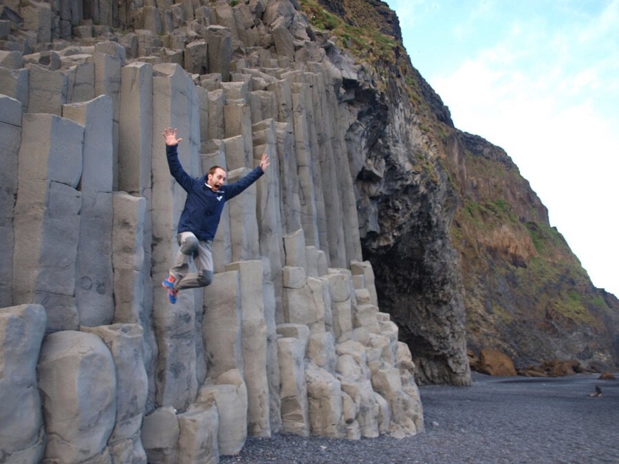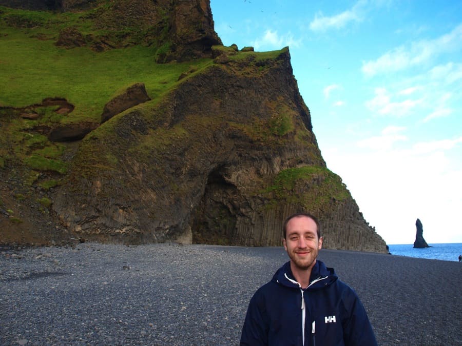black sand beach of Reynisfjara, where the cliff seems naturally pixelated and some creepy pointy rock pillars emerge from the sea, as if an ancient ocean god tried to grab the cliff with its gigantic claws right before getting petrified.