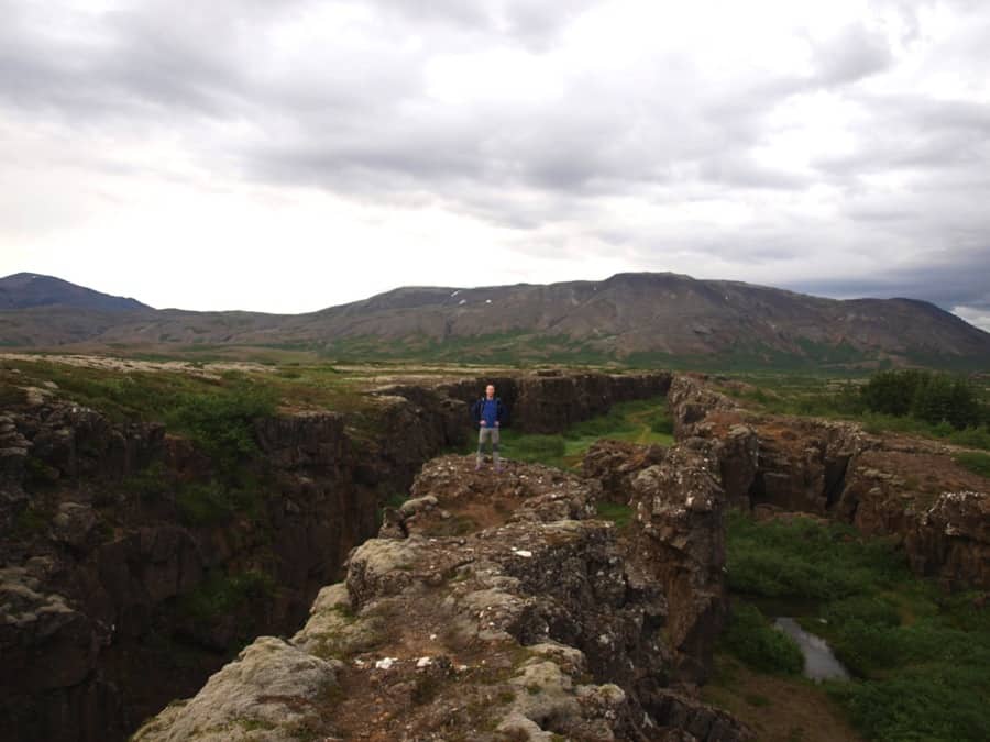 We get to Þingvellir, and very soon we find a huge fissure we assume to be where the plates encounter. It reminds me that the earth is just as alive as we are. We explore the place while running and shaking to get rid of the flies. There are many many flies, hopefully just in here. I try to find a place to put one foot on a continent and the other on the other one, but it’s too scary.