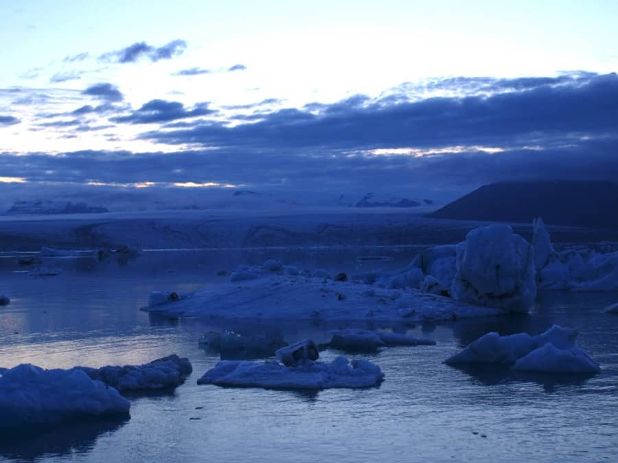 The lake was full of icebergs! It starts right where the glacier ends, and it flows into the sea right here, under a moving bridge. Furthermore, it’s almost midnight, and the light is spectacular. Everything is intense blue.