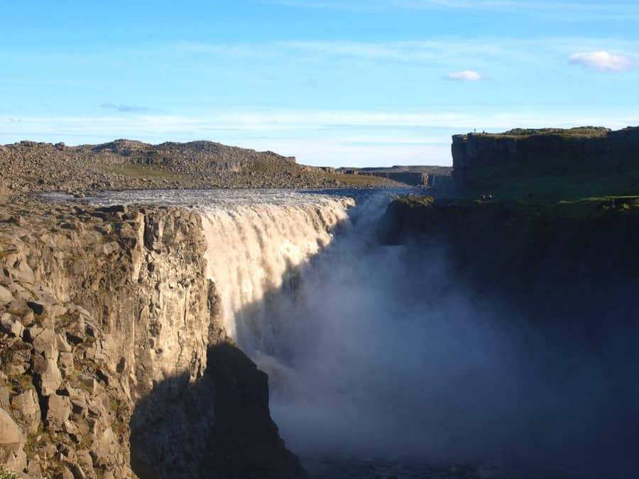 After walking barely a hundred meters we run back to the camper van to get the camera. Apparently foss means waterfall because right in front of us, invisible from the road, a humongous crack on the earth let 150 cubic meters of water per second fall into a river.