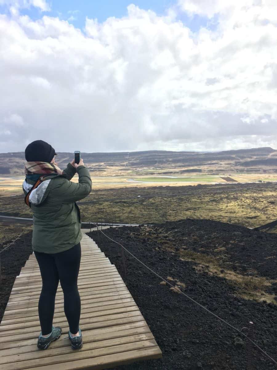 Action shot of Dani being amazed by the Icelandic landscape at Grábrók Crater