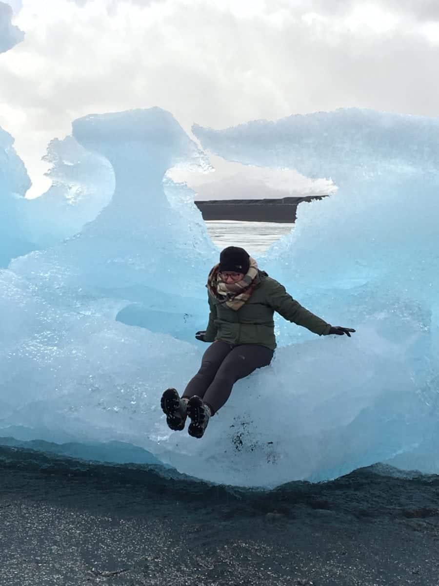 Emily holding part of a glacier at Jökusárlón & Dani sitting on a glacier at diamond beach