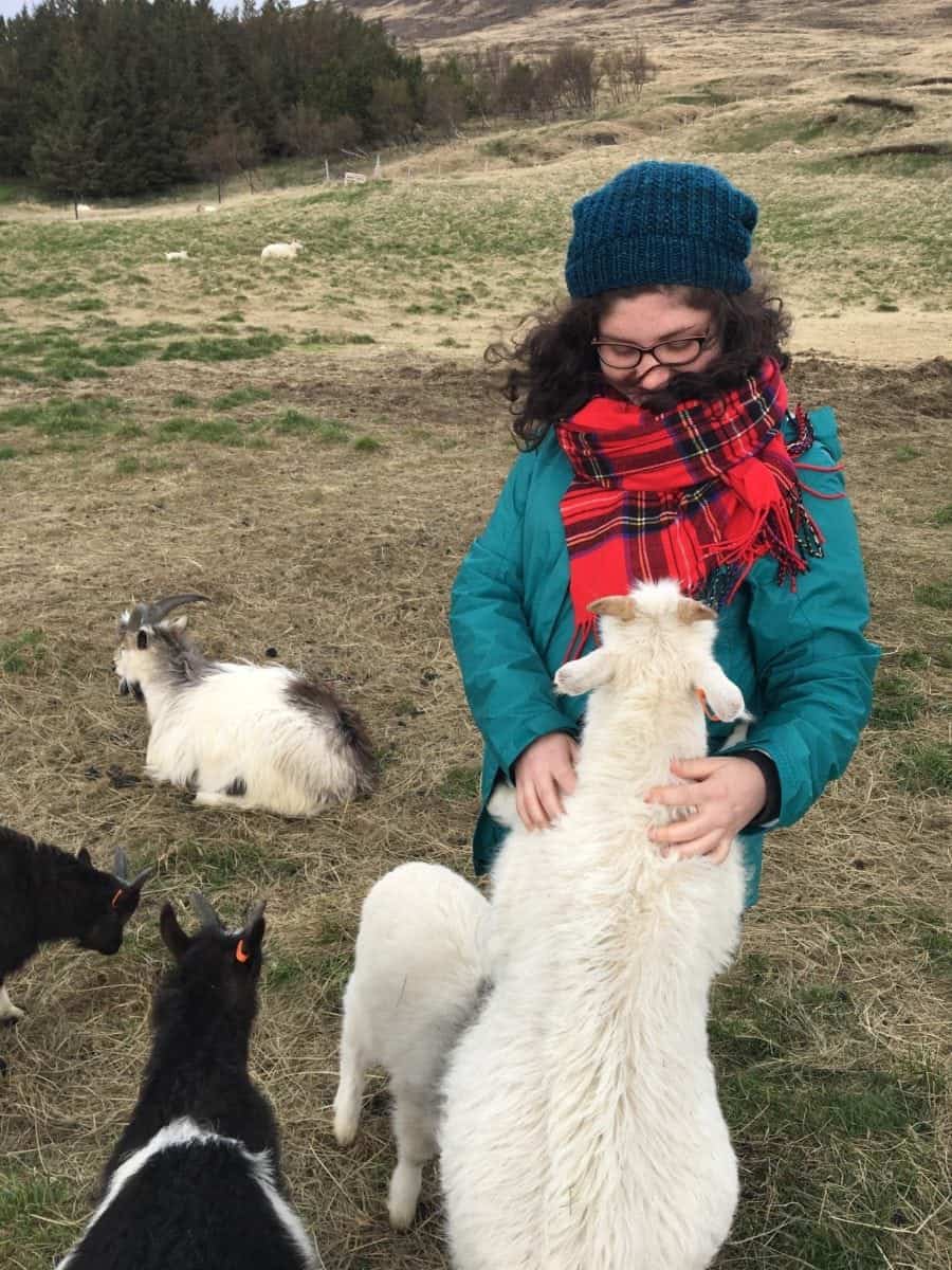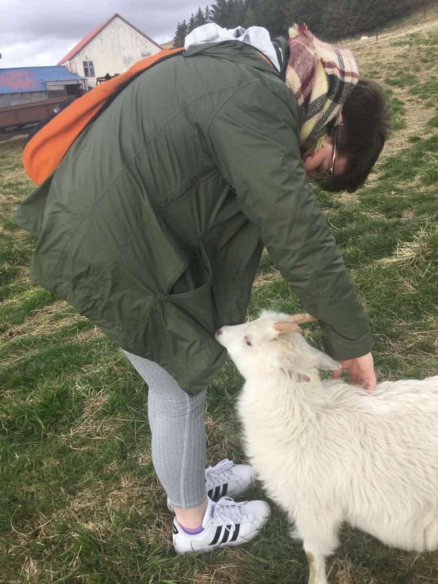But we decided this was not enough wool for one day! Our next stop was a the Háafell Goat Farm, where we got to see where (goat) wool comes from. We cuddled baby goats and lambs, and were sufficiently gnawed on by the curious teenage goats who were particularly fascinated with shoelaces!