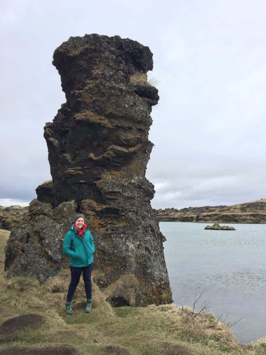 Goðafoss Waterfall (left) & Emily in front of a lava formation around Mývatn (right)