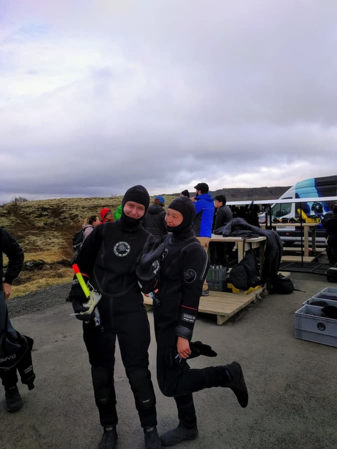 Snorkeling in the space between the North American and Eurasian tectonic plates is not to be missed. The water is fresh from a glacier and filtered through lava before it fills the fissure, so visibility is beyond 100m! It is also freezing cold, so we wore dry suits (think a warmer version of a wet suit- the water can’t get to your skin) with our long underwear and wool socks underneath to stay warm. We’ll be honest- we were SUPER apprehensive about getting in the 2 degree water…