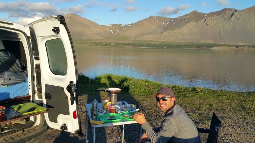black sand beaches. We continued on to Skaftafell (Vatnajökull) National Park and hiked up to see the unique basalt columns of Svartifoss (Black falls). Every photographer’s dream is Jökulsárlón lagoon with icebergs melting and heading out to sea. We pulled over to watch these strangely shaped blue ice sculptures. That evening, we stayed in the harbor town of Höfn and treated ourselves to langoustine pizza and pasta at Kaffi Hornið. By that point, it seemed completely normal for us to eat our dinner at 10pm and then find a scenic place to park and call it a night.