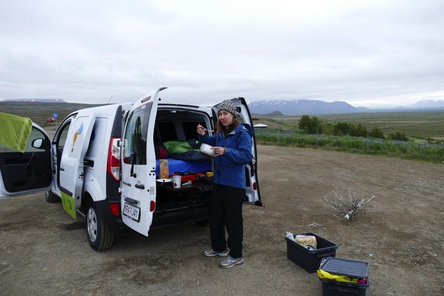 where Game of Thrones filmed). Then we restocked in Reykjahlíð, the town on Mývatn lake, and made sure to include Skyr yoghurt and dried fish jerky in our supplies. Mývatn was very pretty with lots of birdlife. The highlight was hiking through the Dimmuborgir “Dark Castles” area – these unique lava fields look like faces and man made structures. We were alone on the path and when we reached the “Kirkjan” lava tube structure and felt a warm breeze, I had a strange sensation of being brought back in time, as centuries before me have gazed on that same bizarre natural monument. We finished off the day with an evening soak in the