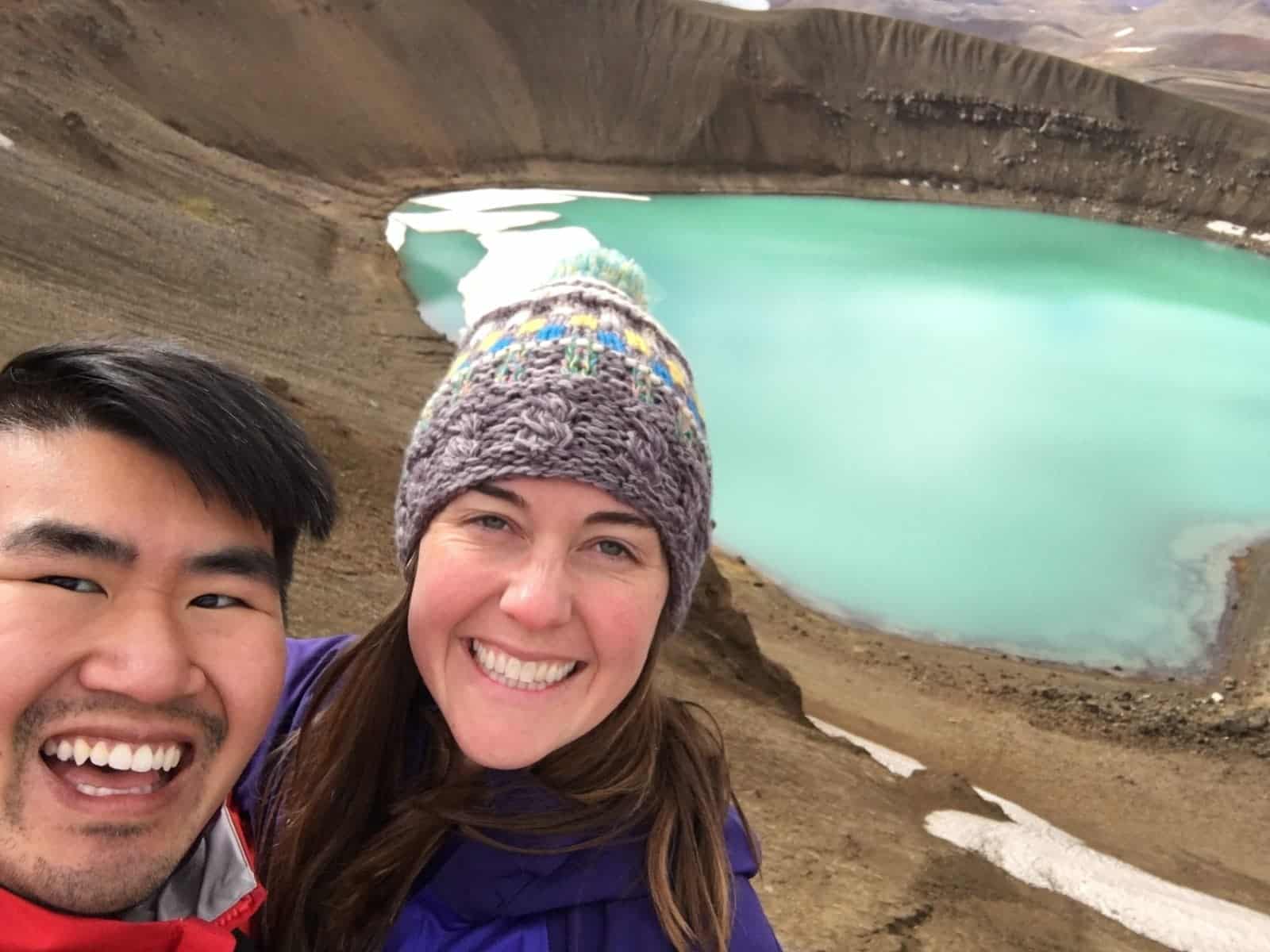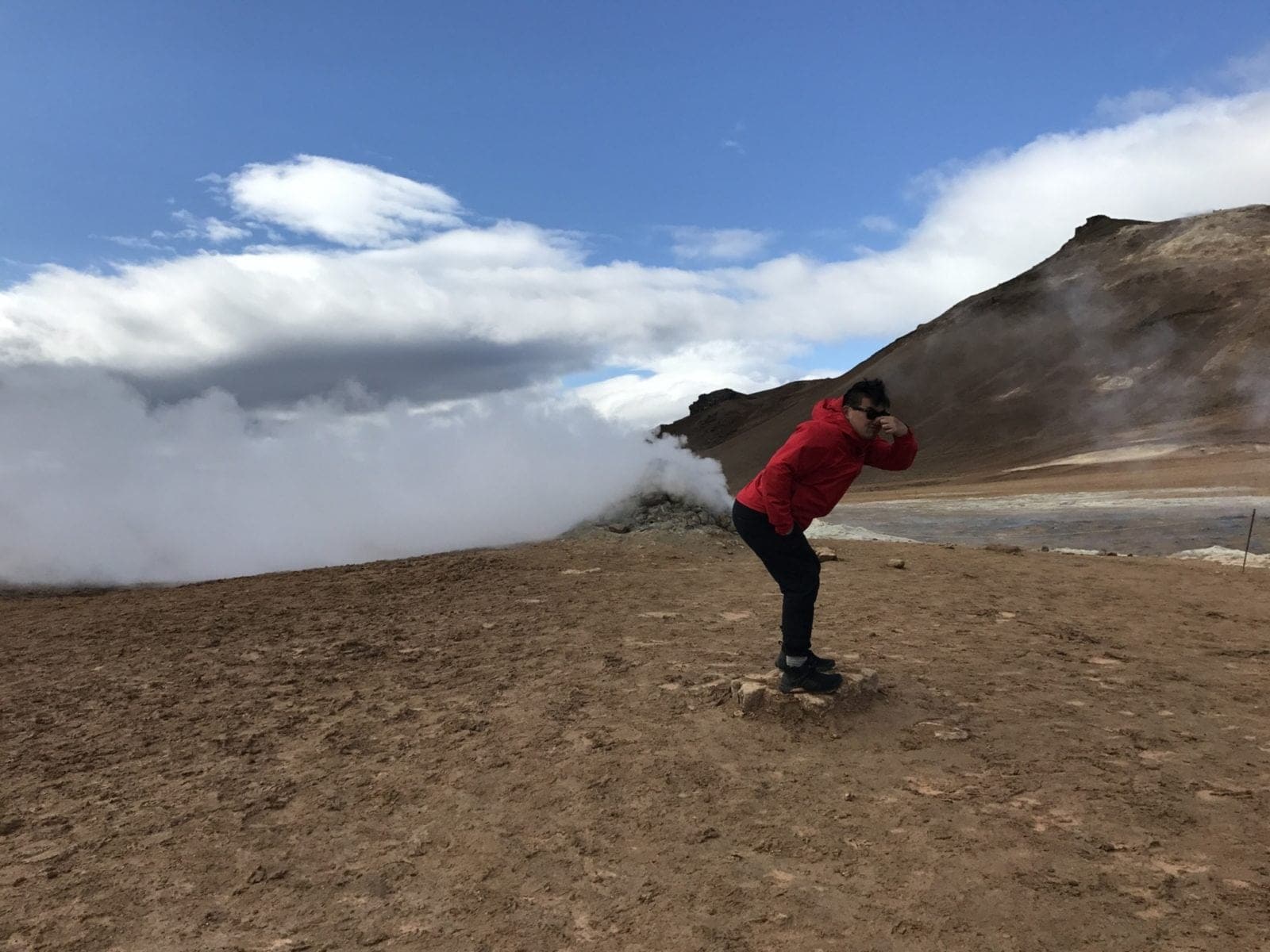 Unfortunately, the road north to the Ásbyrgi Canyon was closed so rather than head north, we headed back into the Lake Mývatn area. When we first arrived at the Krafla volcano, we were met with the sounds of people clapping their boots and one of the thermal vents screeching to the heavens. We hopped out and made our way up to the top of the crater and found a gigantic pool of water not dissimilar to the water we swam in the night before. By the time we got back to the camper van, we looked at our boots and realized that the clapping was not for Vin’s incredible ability to back the van into a parking spot, but for half the crater we took back on our boots.