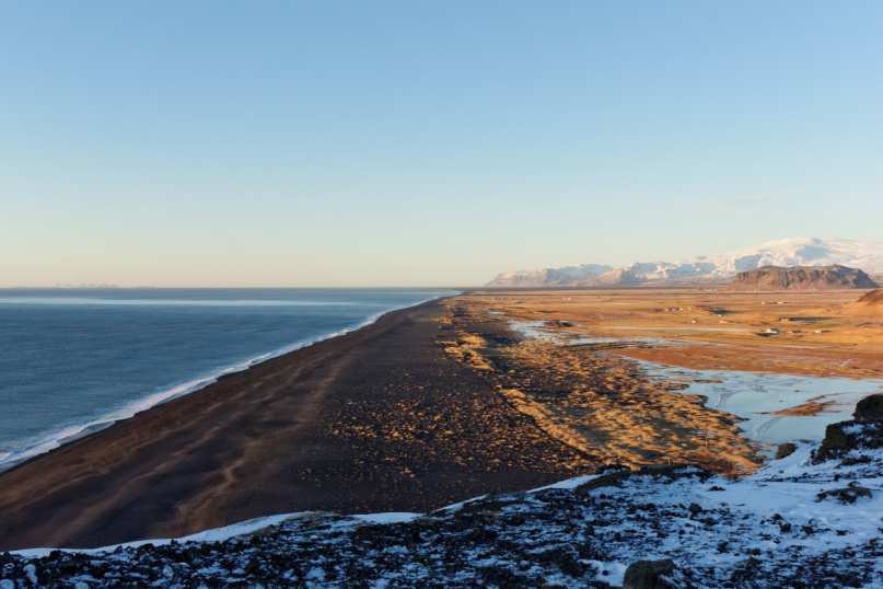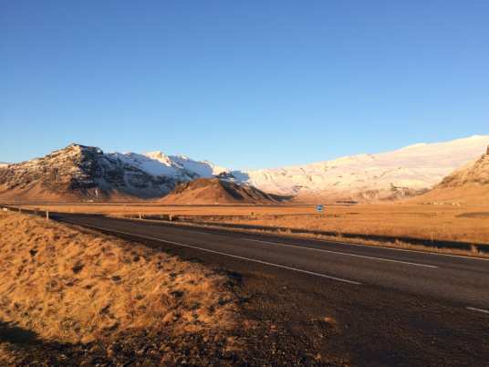 To reach this place, we took the ring road around Mýrdalsjökull glacier along the south coast. This dry and blasted geography is crippled with next to no vegetation and scarred by giant black volcanic rocks from previous eruptions. Driving through this shadowy silent world makes the experience unforgettable and bestows a feeling of freedom. On sunny days, the warm flickering light of the sun reveals the rocky mountains with their white cap of snow, contrasting with a bright blue sky. The view is simply astonishing.