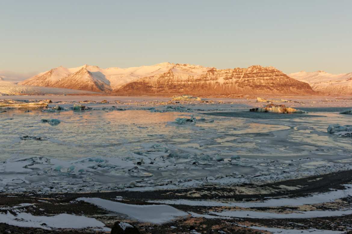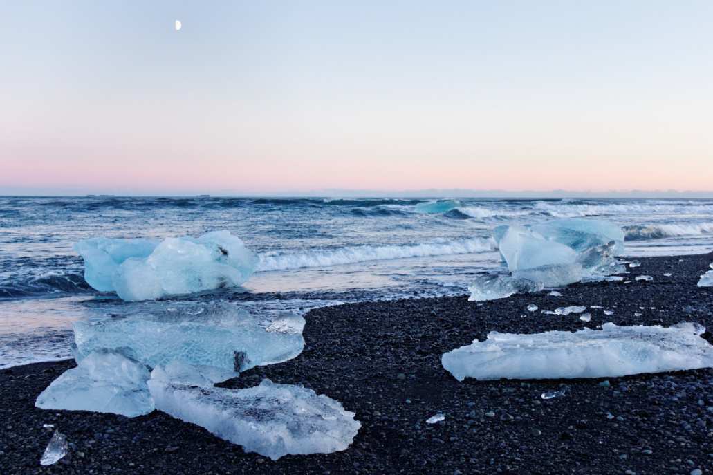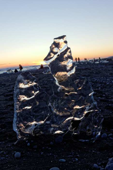 glaciers of Vatnajöjkull. Due to global warming the melting of the glacier is so quick that a lagoon has formed right at the bottom of the glacier. The water and gigantic icebergs follow its course to reach the North Atlantic at the mouth of the lagoon. The black sand beach, also known as “Diamond Beach” ensnares diamond blocks of ice before the waves of high tide brings an impetuous end to their narrative. It’s a bittersweet setting, for although magnificent to observe, the ice tells a story about climate change and the virtually irreversible devastation the human race has upon our home, our planet Earth.