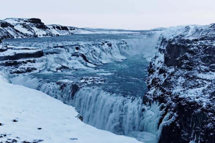 First stop: Gullfoss, for a morning sightseeing of the dramatic waterfall. The gust was strong and the temperature was reading a frosty -8º Celsius. A thick inch of ice saturated the walkway but the rising of the sun on top of the highland plateau was announcing a sunny day. Crampons were not essential here but can make life easier.