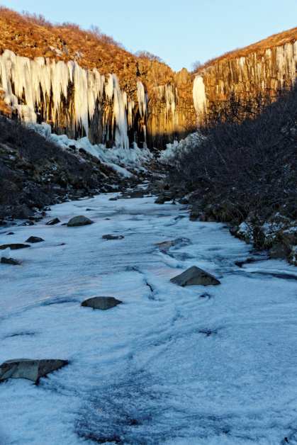 When we arrived to Skaftafell the sun was just coming out. We had a hot coffee at the visitor center and headed for a 45 minutes hike to Svartifoss waterfall and Sjónarsker view point. Most of the hiking path was covered with a thick layer of ice, which wouldn’t be possible to access without crampons. Luckily, the sun was shining and we could feel a little warmth on our cheeks as we hiked to the waterfall. From Sjónarsker, we could see the vast lowland lying toward the ocean dominated by the peaks of Vatnajökull. The mist curled and smoked above the marshes in a dream like wisp.