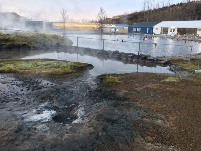 Secret Lagoon is really charming. The pool is surrounded with mini geysers, from where the ejecting water flows directly into the pool. Although the water at the geyser is so hot that it turns the surrounding mud into acid, the water cools to a pleasant 40º Celsius open arrival at the pool. This hot spring is less well known compared to the Blue Lagoon on the Reykjanes peninsula and therefore it’s not as packed and more family oriented.