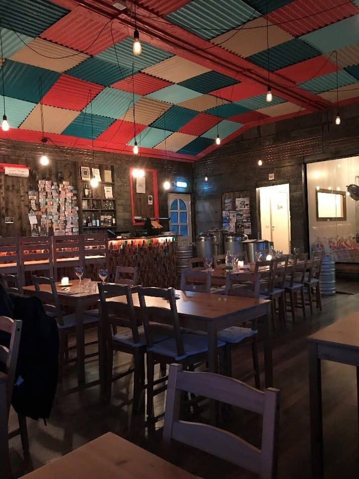 We stayed at Jökulsárlón for about an hour and then continued on towards Höfn. We checked into our campsite and looked on our phones to see if there was anything in the area to check out. After a little research, we found a website for a brewery about 20 minutes west of Höfn. We couldn’t tell based on the website if they were open yet, but we decided to head out and check it out anyway. We arrived to Jón Ríki, brewery and restaurant, and thought we were in the wrong place. There was a barn situated between a farmhouse and some other buildings. The barn was what appeared to be the restaurant based on the parking signs. We went inside and were floored by how awesome it was! The inside had a bright colored ceiling, reclaimed wood walls and a neat wood bar. They had a nice glass full sized window so you could see the beer brewing setup. We sat next to the window and could look out at the mountains and watch the sunset. Although there was every musical instrument you could think of displayed in the back corner, there was no music this night.
