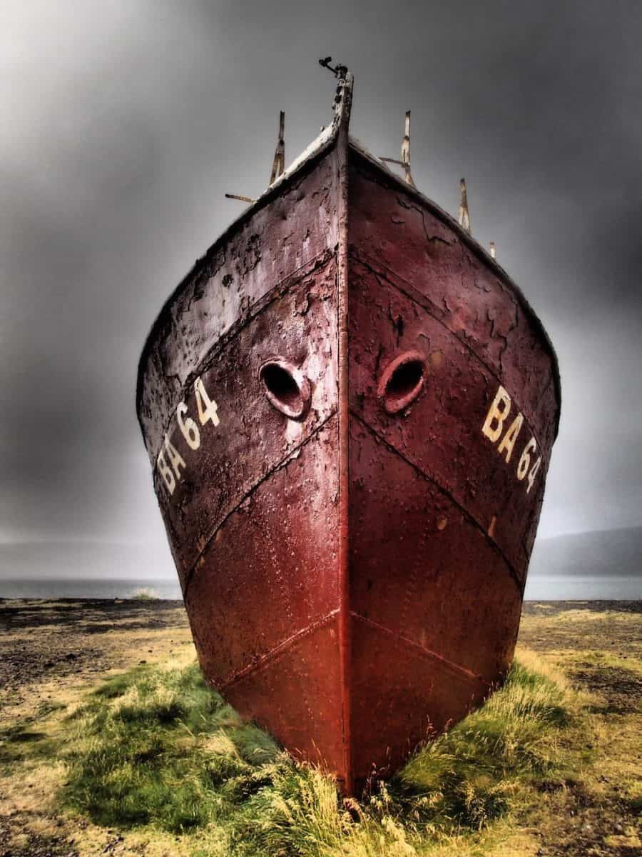After Dynjandi, we headed to the beached Garðar BA 64 ship. This is the oldest steel ship in Iceland built in 1912 and has been beached since 1981 when it was decommissioned and then subsequently dragged on shore by locals who wanted to preserve it. It was very stormy and cloudy with rain coming down off and on while we were there. Despite the sign requesting people not climb on the ship, there were several people climbing all over it which made it more of a challenge to get photos of the ship without people in our shots. It is fun looking back at some of our photos and reflecting about times we had to wait for someone to move just right to snap the photo.