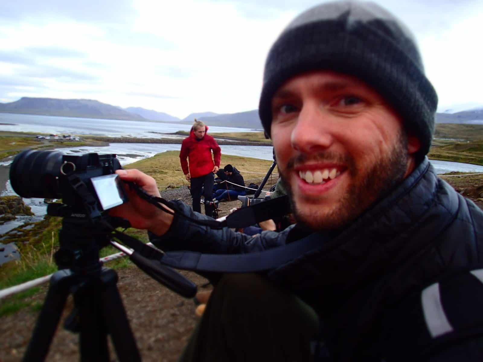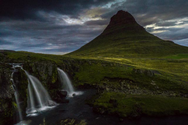 We made it to Kirkjufell before the sunset and it was extremely windy. When we got there, people were coming and going, including a few tour buses full of tourists. They key to the photographs for this location is walk up the path, over the falls and to the other side. Most people walk up the path and get shots from the right side of the falls, but the better shots are from the left side. As the sun was setting, there was at least 12-15 of us all lined up along the path (on the left side of the falls) getting shots of the falls and mountain. As more groups of people would show up, they would slowly make their way up the path taking photos without seeing the line of people on the other side getting photos too. It made it for just that much more of a challenge as we would get short bursts of time when no one was on the path and everyone would take a series of photos before the next group of people hit the path and meandered their way up.