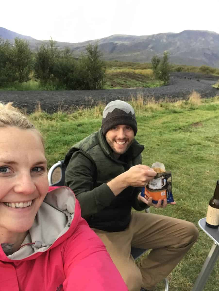 To save time and money, we flew in enough freeze-dried meals for both of us, two meals a day. This worked out great with the camp stove and supplies that came with our camper van. It was really convenient to have the large water jug that came with the camper van too because all we needed was water for our meals.