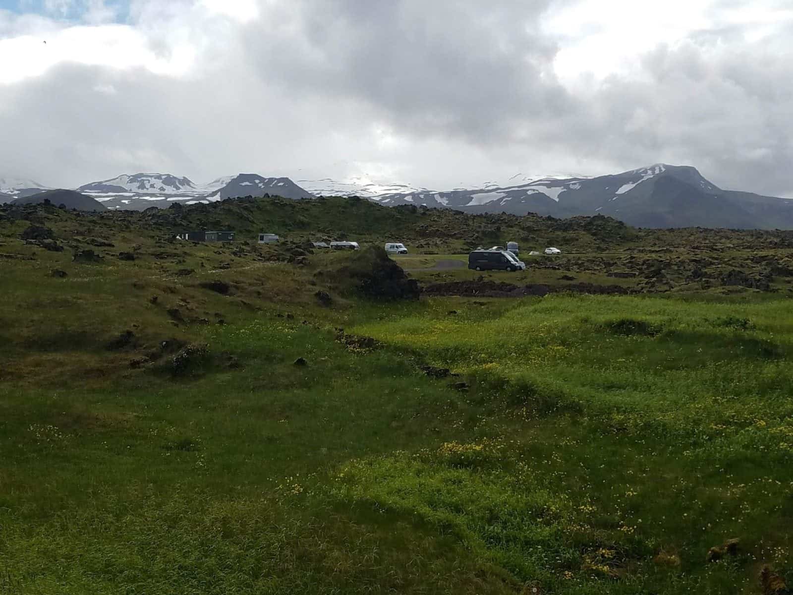 North of Borgarnes, the van climbed onto a lava-crusted plateau and we glimpsed the bases of the mountains that run down the spine of the Snæfellsnes Peninsula. In less than an hour we had passed through this range and were descending the north slope of the peninsula into the beautiful seaside town of Stykkishólmur. This turned out to be our favorite town of the whole trip and is pronounced exactly how it looks, but my husband referred to it as “Stishkish” or some other random assortment of consonants for the duration. It was evening, but as it never gets dark in Iceland in the summer, and as the sky was still covered in clouds, the day still seemed young. The town campground was in a verdant, slightly muddy field on the outskirts, and we paid the camping fee to a Los Angelean who plays on the local semi-pro women’s basketball team. It was a short and pleasant walk downtown to an excellent restaurant for dinner. Afterwards we walked across the harbor and climbed a steep hill to see the town’s old lighthouse and a fantastic 360-degree view of the Snæfellsnes range, finally emerging from their cloud cover, the North Atlantic, dozens of tiny green islands, and far to the north, the West Fjords. Someone later told us that one of the islands belongs to Bjork. Passing the town swimming pool and playground on the way back to camp, we encountered two look-alike little girls in matching Icelandic Lopi sweaters doing back somersaults and flying aerials on massive rectangle of inflated rubber attached to the ground by its edges, an awesome piece of playground equipment never seen in the United States. It was ten PM (22:00). Rob took a video.