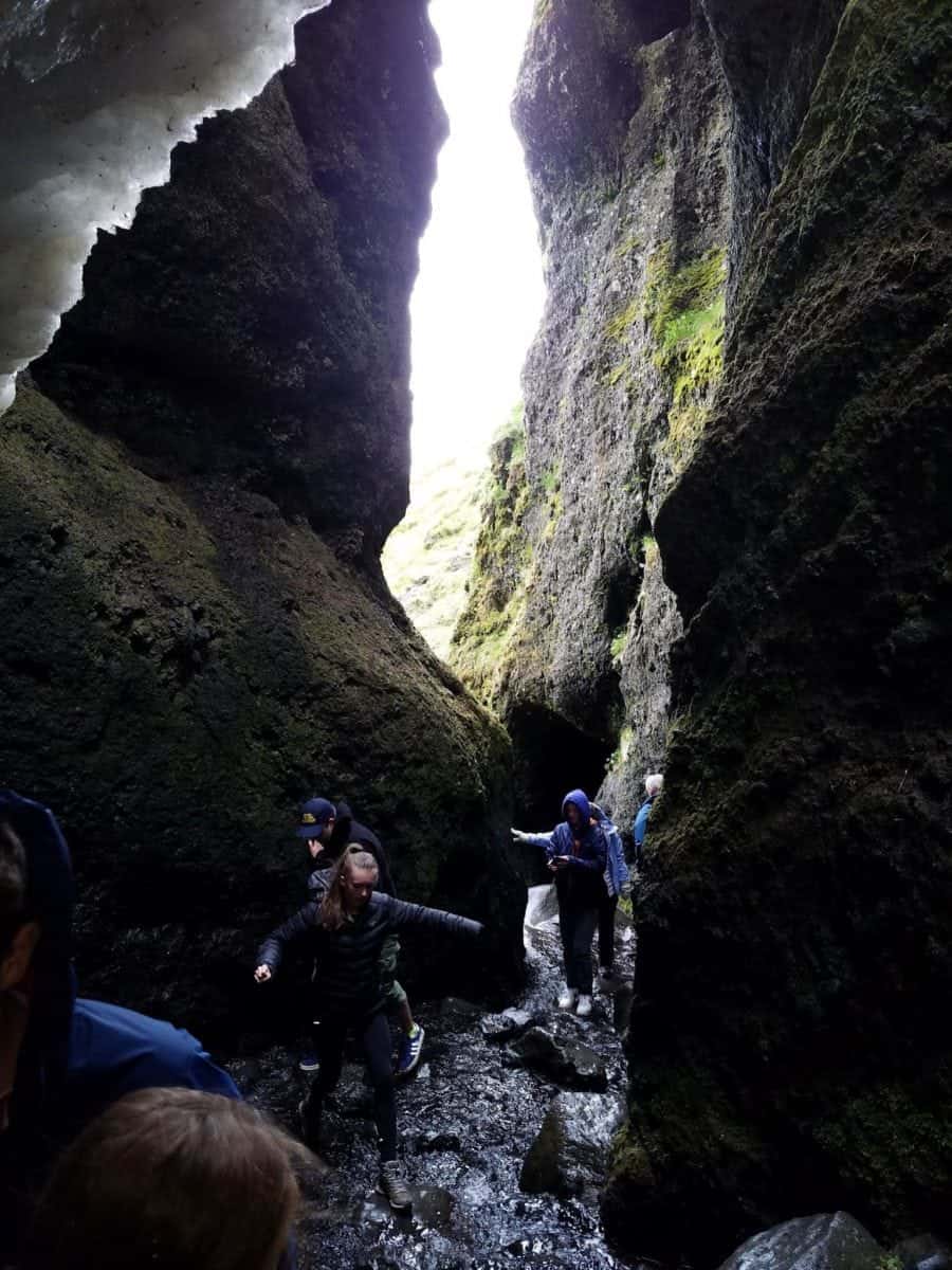 We headed east , stopping briefly at Rauðfellsgjá Gorge. This is a narrow crack in the mountainside that you can hike into. In our part of the world it’s made of red sandstone and we call it a slot canyon, but this one was eroded from the black basalt and packed with melting snow except for a gap at the bottom about five and a half feet high. In the middle of the afternoon with two tour buses visiting, it was the only crowded location we encountered on the peninsula. Rob stayed in the van to eat his sandwich, but I ventured up the steep slope with a long line with teenagers and Asian tourists to boulder-hop into the mouth of the canyon. After a couple of zig zags I became claustrophobic and had to get out, not because of the close black walls on either side and the overhanging snowbank hitting me wetly on the head and shoulders, but because of the endless stream of people. This one is better visited early in the morning or after dinner, I think.