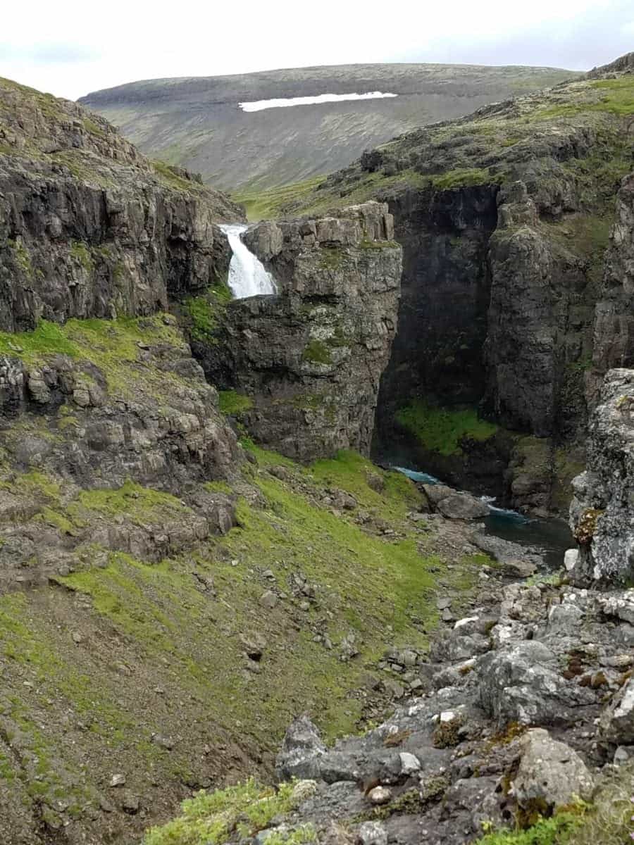 After the invigorating iced footbath, the trail climbed very steeply up the right river bank for another mile. At some, though not all of the steepest and slipperiest points, a cable or marine rope was strung between metal posts. The roar of the falls grew louder, the mist thickened, and numerous gulls and auks wheeled above us, but Glýmur remained out of sight until we reached a high cliff edge. Then it revealed itself all at once, a narrow spear of crystal dropping xxx meters through a spectacular black and green gorge dotted with nesting and wheeling seabirds and crowned with mist, the stuff of your wildest Icelandic dreams. Words and pictures cannot capture it; you are going to have to see it for yourself.