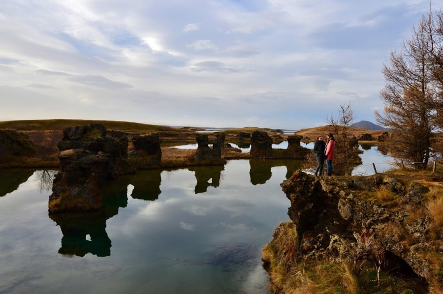 When we went to see the famous craters of lake Mývatn we drove from the Krafla mountain to the left side of the lake (editor’s note: The southeast side). Pretty soon you will see the craters in the lake, you’ll see a parking spot on the right side of the road, there is almost nobody and it looks like an enclosed area (it’s called Kálfaströnd). You can walk through the forest and then choose whether you want to hike; to the top of the hill and take a look over the lake and see the craters, but you also can choose to go to the edge of the lake. The lake is so clear that you can see the bottom from every point of view. It is a beautiful photo location, all the rocks in the surrounding reflect beautifully in the water.