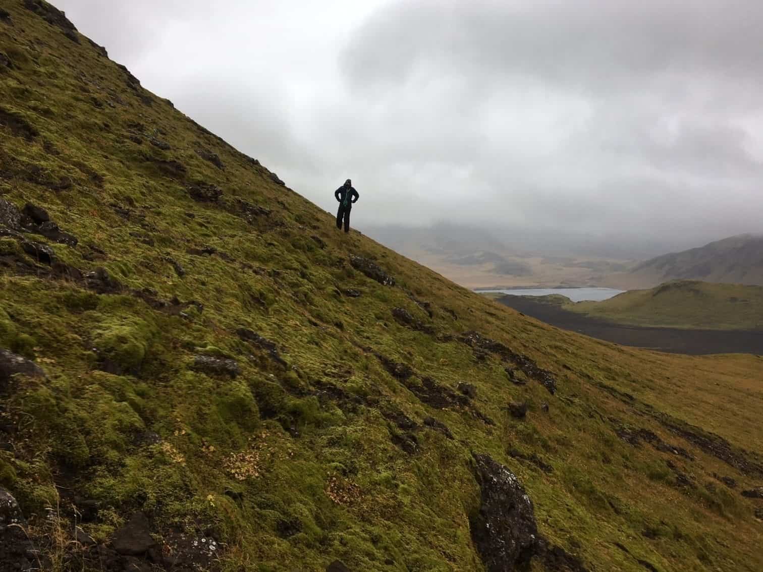 From the tourist information we were advised to take the hike to Hatta, a mountain of 504 meters overlooking Vik. The hike is marked all the way to the top. The weather was tough, with heavy winds, but it was dry and relatively warm, so after reaching the summit we decided to leave the trail and go further into the wilderness.