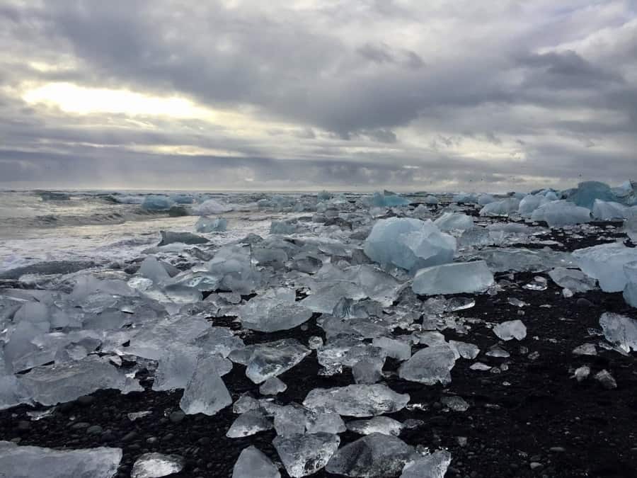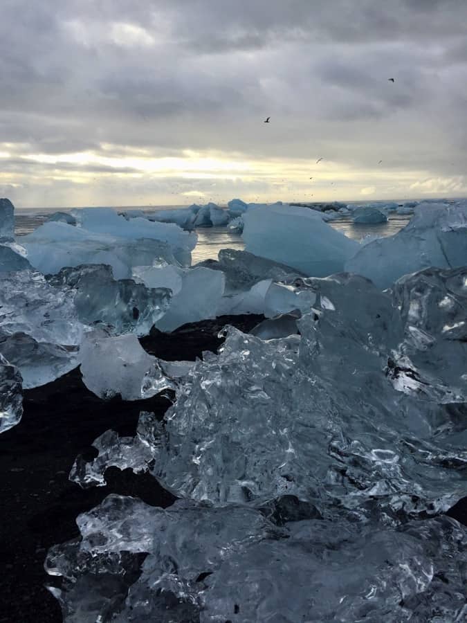 It took us a while to turn away from that goofy seal dabbling between the ice shells and we finally moved on to diamond beach which is situated right next to Glacier Lagoon. If at the moment you are making travel plans for Iceland, stop right here and schedule some extra time for this magnificent spot. We all agreed that this was the best part of our travels as we are sure this is unique and cannot be found anywhere else on earth. Ice blocks were stranded all over the beach sparkling in the light and holding the perfect contrast to the volcano stamped black beach. We tried to capture those beautiful memories on camera but all you can do to see this perfection of nature is to pack your camper and stop by.