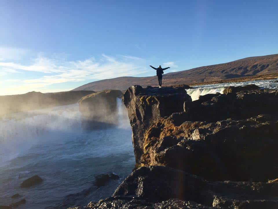 Goðafoss waterfall, however the ride took a bit longer than expected because of the many stops we had to take to photograph this extraordinary landscape. We made a 40 minute stop to take pictures and only to realize in the end that it was just 500 meters away from Goðafoss. Arriving there, we were thrilled to see our first waterfall in Iceland. Stupid as tourists are, we risked our precious lives to get the perfect shot. Here you go: