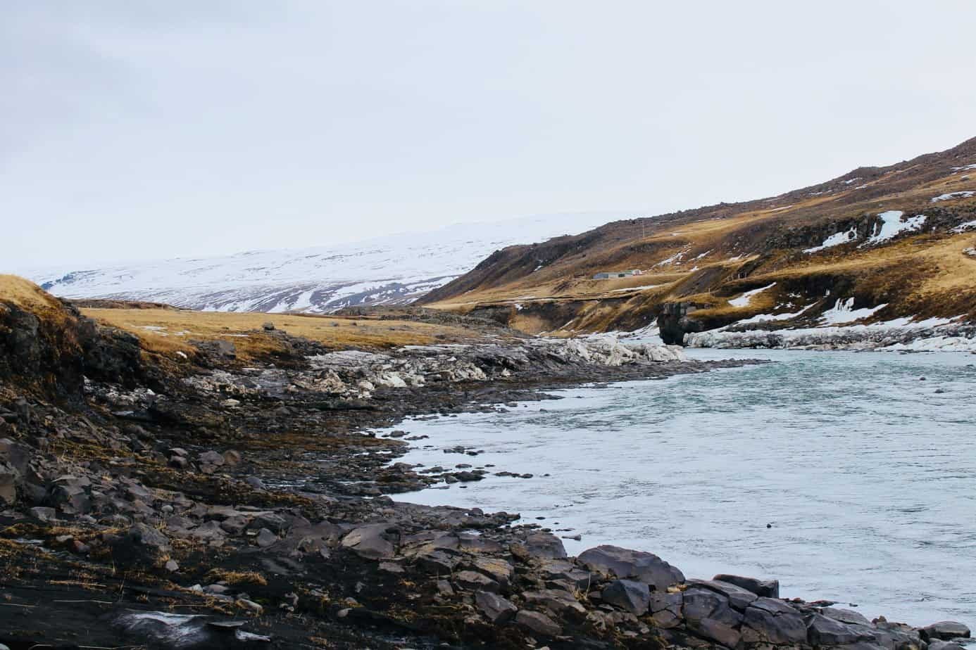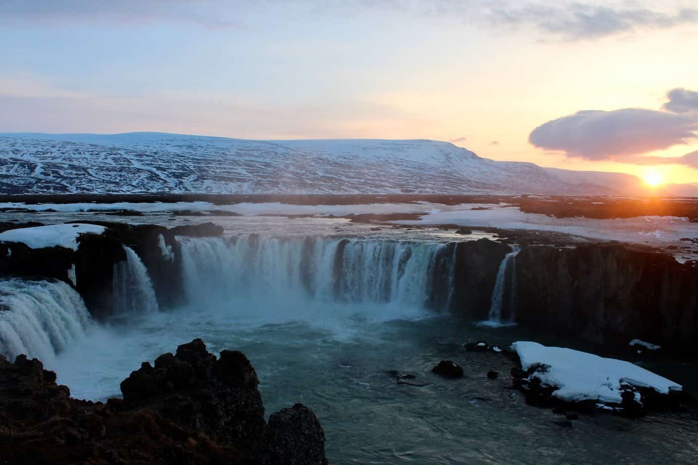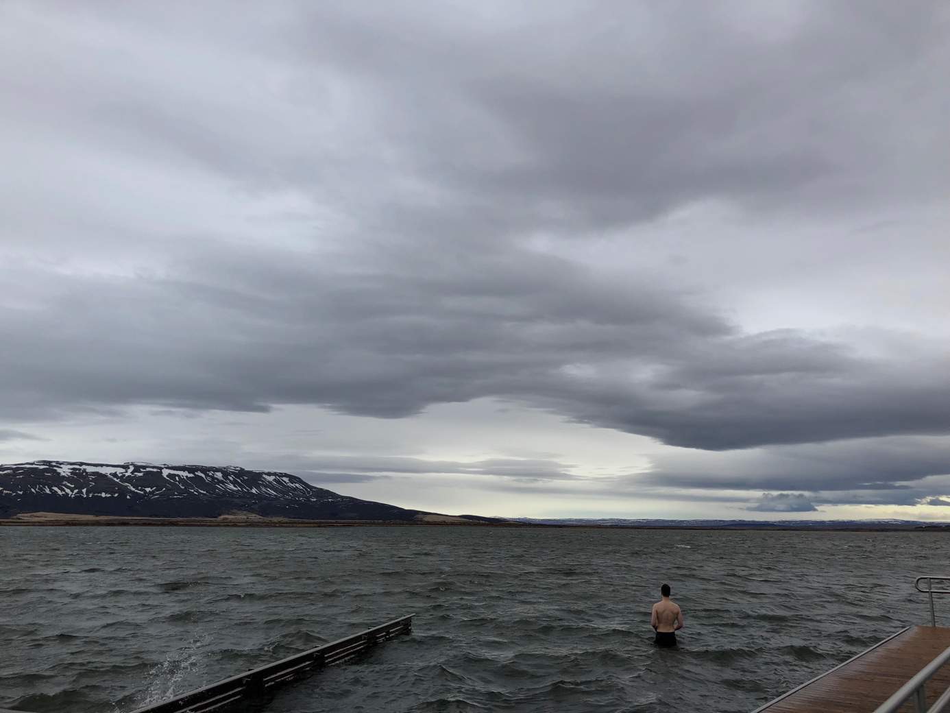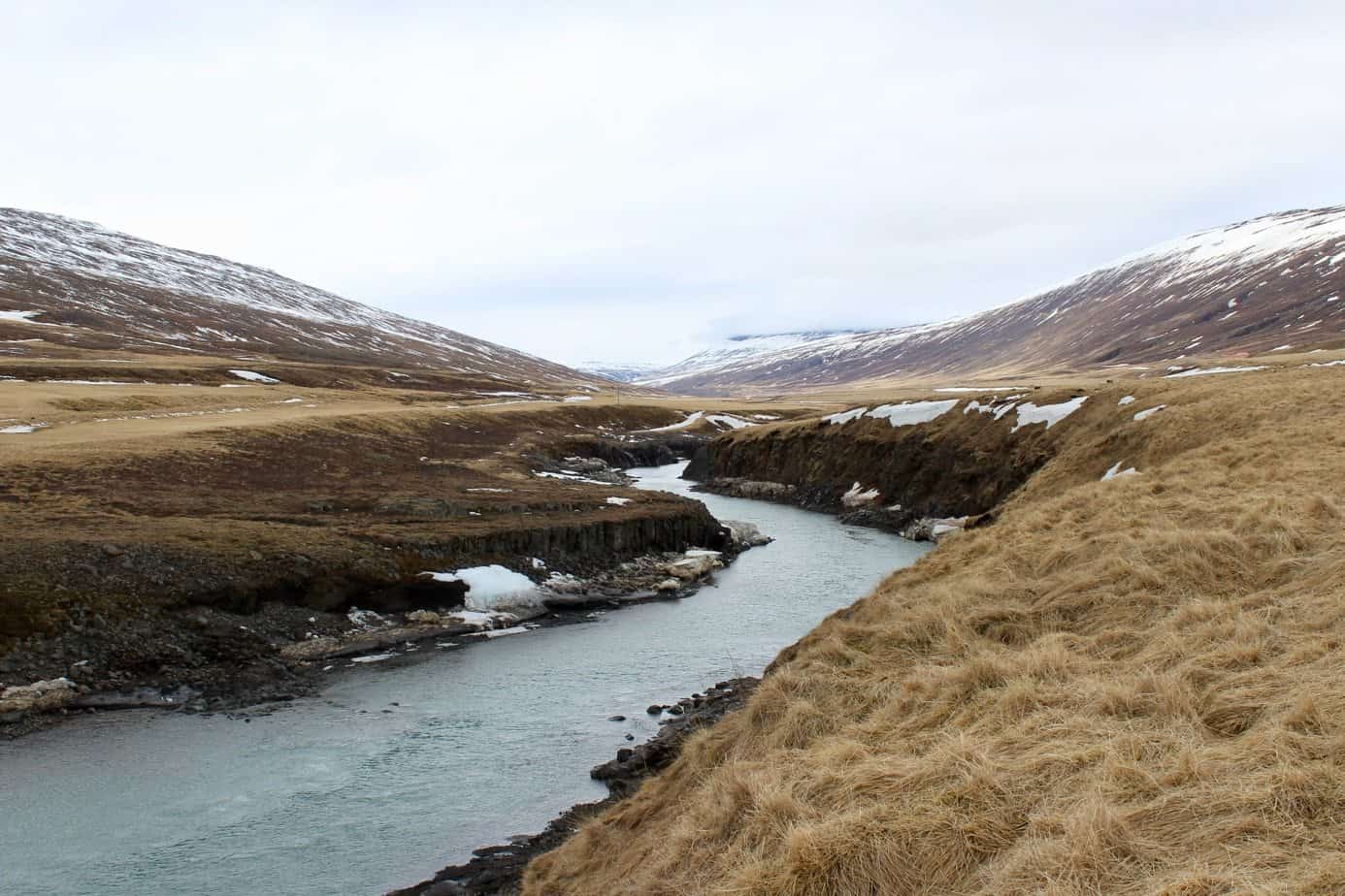 The highlight of the day came as we were about to reach our campsite. We saw a few campers parked and a big source of water, so we pulled over. The view was surreal, the sun was beginning to set and the water was a light shade of blue. We took a short walk up a walkway and found a winning view in þingeyjarsveit, which you can judge for yourself.
