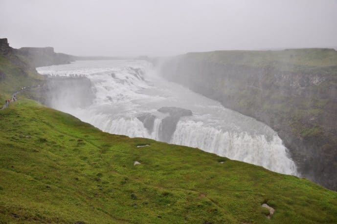 The famous Gullfoss waterfallVisiting Þingvellir we were immediately overawed by the sheer size of the rift that makes up the most significant aspect of the area and could well imagine the gatherings in ancient times. Onwards though to Geysir and Gullfoss to be, once more, impressed by the variation in landscape in such close proximity. The hot flowing water at Geysir (and the smell!) to the sheer majesty of Gullfoss. It was a breath taking day and, in spite of the weather (still drizzly), will live with us for a very long time to come.