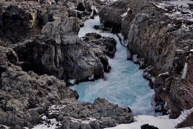 Our last day with our van was the only day we had with grey skies (we had been extremely lucky). We started off with the Kerið crater. Typically, the water is a vivid aquamarine colour, for us though, since it was April the crater was still covered in ice. Our colours were not as striking as what typically is seen at this sight but the crater was making mysterious cavernous type groans that were coming from the centre under the ice. It added a mysterious and almost eerie element to viewing this spectacular landform. You can walk around the top of the crater and then you can descend down to its base near the waters edge (for us the ice edge).