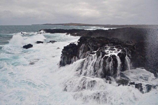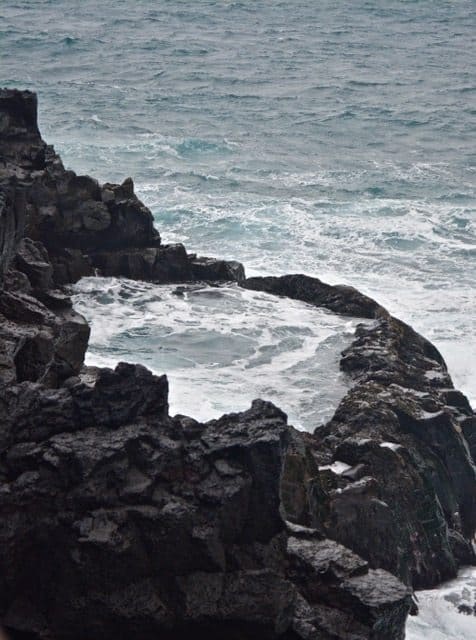 Just a short drive past Grindavik we came to Brimketill. Brimketill is a large natural pool that sits at the bottom of a cliff on the oceans edge, that has been carved our by the pounding of waves on the black lava rock. The pictures we had seen were a peaceful and calm pool by the ocean but what we experienced was the complete opposite. In the non-summer months the ocean is much more fearsome. There is a small platform at the top of the cliff that you can view the area from. This platform provides a spectacular view however it is still a bit frightening. It is not particularly high from the crashing waves, and the waves were rolling in hard and high. At times we were thinking one would come and sweep us right off the platform. The spray was surrounding us and the sound of the waves vibrated through our bodies when they crashed upon the cliffs. We did catch the Brimketill pool but you needed to be quick with your camera to capture it before another wave devoured it. Though this was not exactly what we were expecting it was a great stop as it really made us appreciate and respect the power of nature and the ocean.