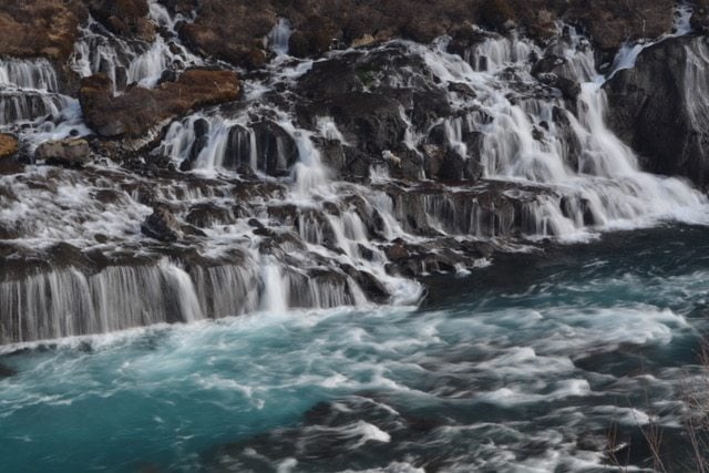 On our way headed south we made a trip to the waterfalls of Hraunfossar and Barnafoss. We highly recommend this as a side trip for other travelers. The waterfalls are close in proximity but each have their own character. With Barnafoss you can feel the power that comes from it as it pounds through the rock surrounding it, and Hraunfossar has the gentle, careening and peaceful nature to it.