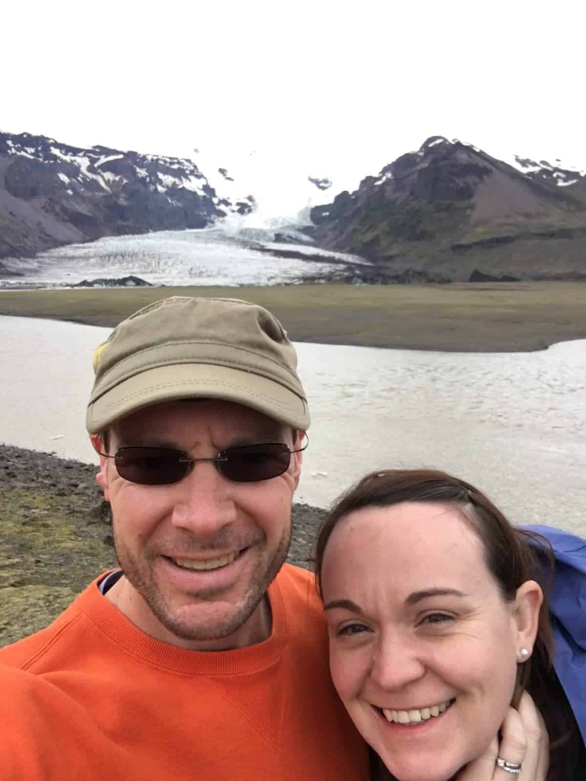 The great thing about not being on a tour bus is the freedom to stop when the mood strikes. Our biggest surprise was when we stopped to switch drivers. We saw a sign for a picnic table and turned down the road to get off the highway. Although the initial view didn’t seem like much, Chippie lead us to a place with a path that ended at a small glacial lagoon called Kviamyrarkambur. Since it was not one of the bigger stops, we were by ourselves and able to enjoy the amazing beauty of the glacier and lagoon … and decided to snap a selfie to remember the moment.