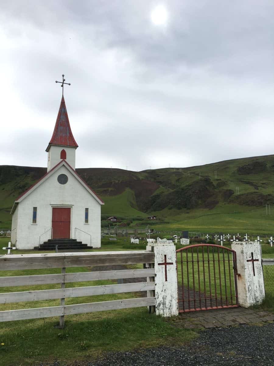 After a good night of sleep and a breakfast retrieved from our camper cooler, we set out for Reynisfjara. The basalt columns set against the black sand beach were enrapturing. Chippie was parked safely in the lot, but we were on high alert for Sneaker Waves. We needed to keep safe for the rest of the trip. As we left the beach, we were able to stop at the local church along the same road for a quick picture.