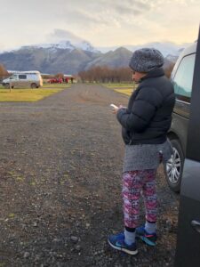 We kept driving and eventually reached Höfn. After exploring the small, cute town, we headed back West for 2 hours, as our map told us there was a better chance of seeing the lights in that area. We found a campground at Skaftafell National Park. We got there after dark but were in for such a treat when we woke up! Snowy mountains and big open grassy plains all around us, even as we brushed our teeth – it was pretty special. Then we packed up and began the drive back to Reykjavik for our last night in Iceland – stopping for a visit to the uber famous Blue Lagoon of course (but it was sold out 🙁 – make sure you book in advance!)