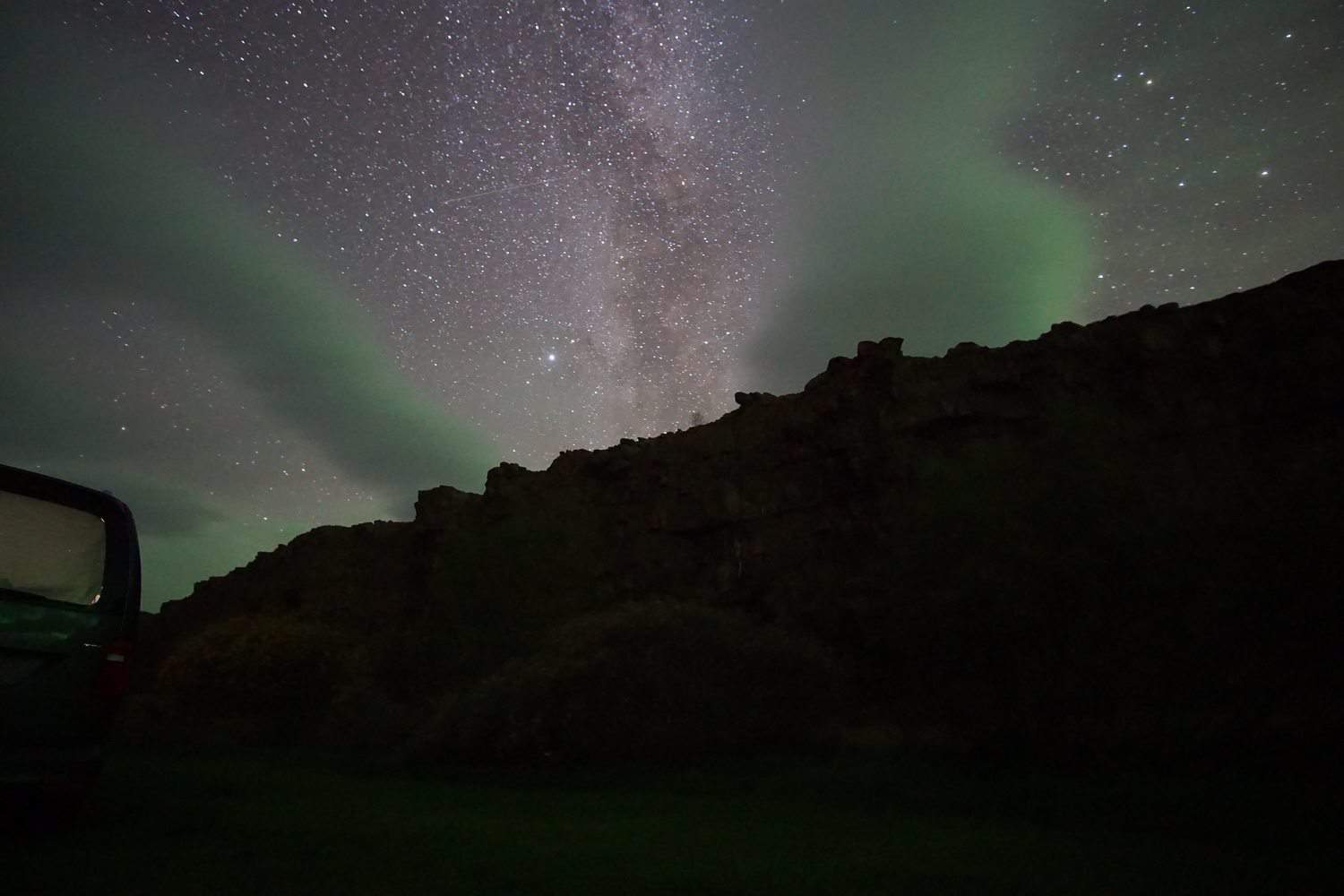 We did make time for a stop in Seyðisfjörður and had lunch at a cute grill and bar called Kaffi Lara to celebrate our 6 year wedding anniversary. The steep and windy road going down into Seyðisfjörður is the road Ben Stiller skateboards on in The Secret Life of Walter Mitty. It’s a super cute little coastal town for an afternoon stop. We ended up camping that night at a little vista point parking lot next to the small lake Ljósavatn. It was here that we saw the Northern Lights for the first time!! David was pumped to try his hand at astro-photography and photographing the Northern Lights, and we splurged before our trip on a nice camera and lens and spent some time watching tutorials and practicing at a park outside of Nashville.
