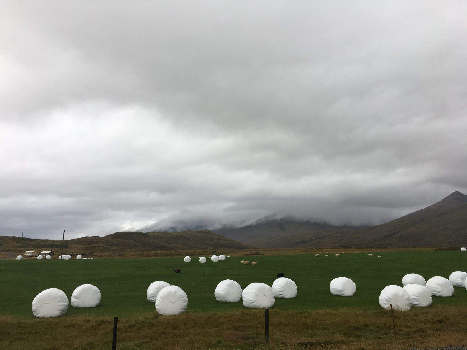 Our goal for the first day was to reach the campsite in Vik, which was a 3 hour drive, and a name we could pronounce! VIK-tory!!!! Stopped off in the fishing village of Grindavik (Another pronouncable name!) for a needed toilet break and a hot meal. Tasty fish and chips, but we could’ve skipped the burger. On the way, sponged up our first impressions: beautiful horses, so many sheep, vastly outnumbering the occasional houses we passed, which all seemed to have lace curtains hanging in the windows. Ever-changing landscapes, but loads of fields of moss-draped dark volcanic rock, extending as far as one could see. Iceland has many vast horizons. From time to time, the edge of the grayish, brooding ocean would peek into view. We admired the ever-changing sky, with varying shades of gray clouds which kept spitting rain into the fierce wind. Passing farms, we noticed large neat bundles of what turned out to be harvested hay. Wrapped tightly (PIC) in mostly white but also pastel pink or mint green, these stood out on the picturesque farms with emerald green fields and we dubbed them “marshmallow farms”. To be fair, they could also be pillows.