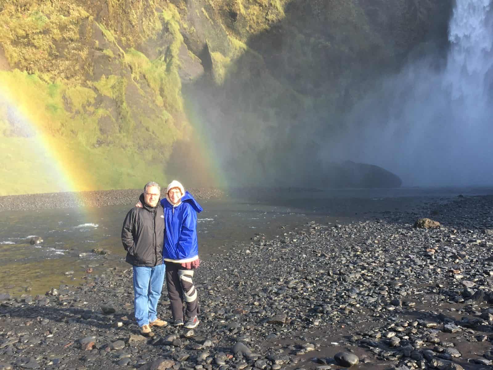Our best rainbow was the next day at Skógafoss: (Day 2) We have never stood under a rainbow, and especially not at the end of one. I can tell you, no visiting leprechaun, no pot of gold and for Americans, no Skittles were there. But, who cared? It was magnificent!