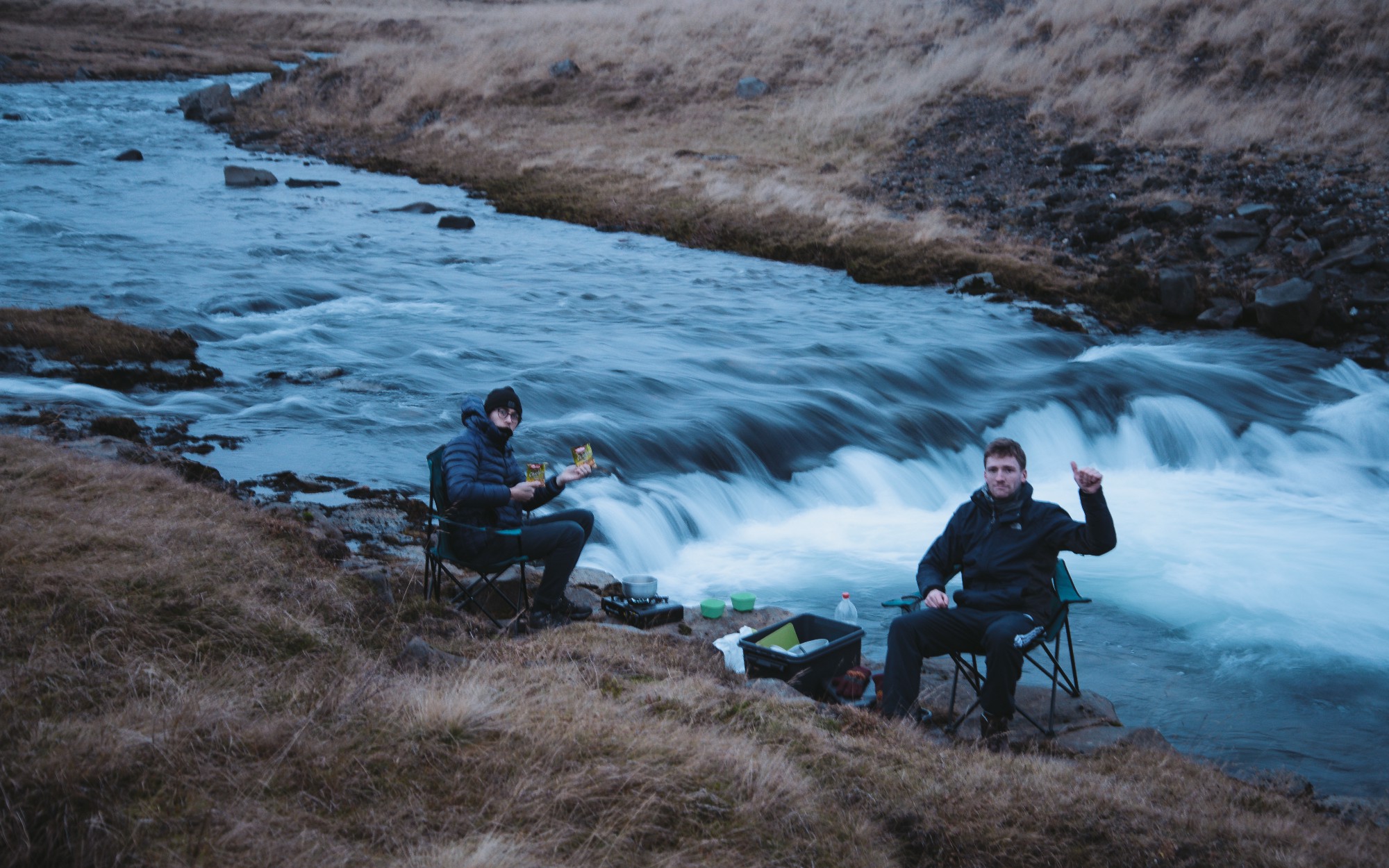 We may have struggled to move our hands in the wind and the rain, but there is nothing more satisfying than settling down to a bowl of 49k. Beef Noodles that you cooked yourself outside the back of the van. Here is me and Matt settling down to it on the first night: