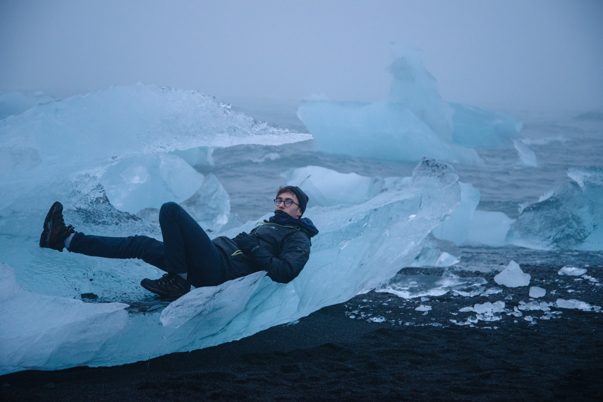 jet-black beach with countless icebergs:
