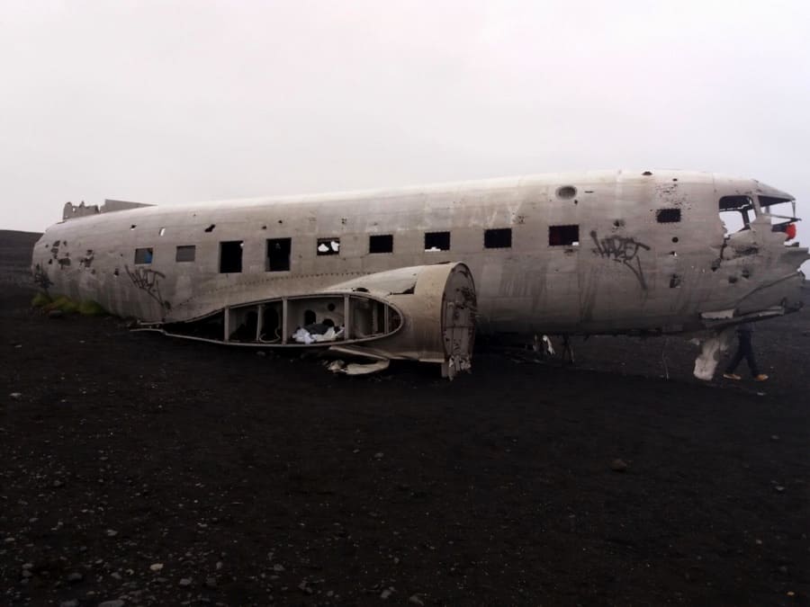 We changed our wet clothes and we went to another closed waterfall: Skògafoss. You can see it also from the top by an uphill walk. We were tired but we didn’t avoid to see the Sólheimasandur airplane wreckage: you have to walk almost an hour to see it , but it worth it: it’s an airplane of the 2 world war forced to land in this black beach, and it looks like the set for a zombie movie.