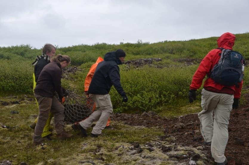 On the Eldborg crater trail, we met a group of young volunteers from all over Europe. They worked on the steps that give access to the crater. On our return, we saw them carrying a big volcanic stone which will be used for the arrangement of the steps. The two men of our group come to lend a hand to transport the stone. That’s how, somewhere on an Icelandic trail, two Quebecers have left their mark…!!!