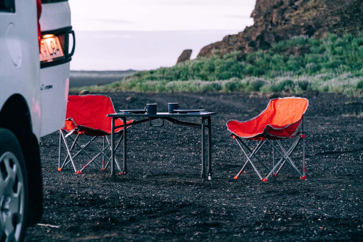 Inside, you’ll find a compact storage area, with room for bags and groceries, plus all the kitchen essentials you’ll need. A table and chairs are included so you can enjoy meals under the stars. The Fiat Doblo Maxi Camper rental is equipped with 230V electricity when connected to a campground outlet, making it easy to charge phones, laptops, or camera gear. A portable heater keeps you cozy on chilly nights, while the compact fridge keeps your food fresh.