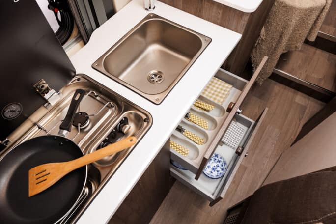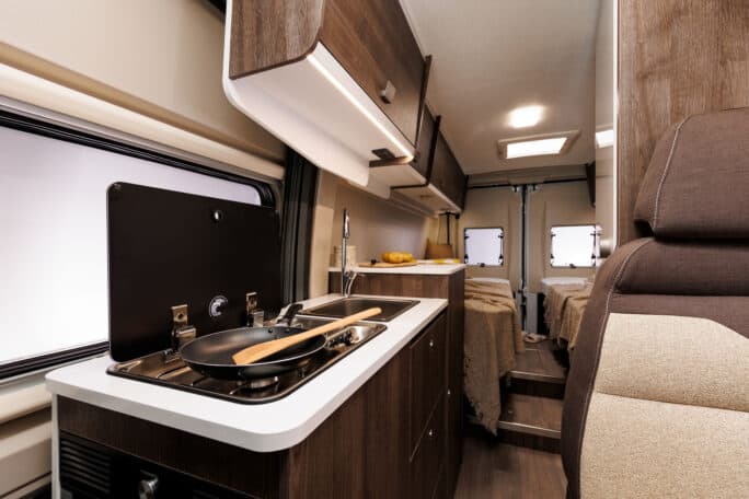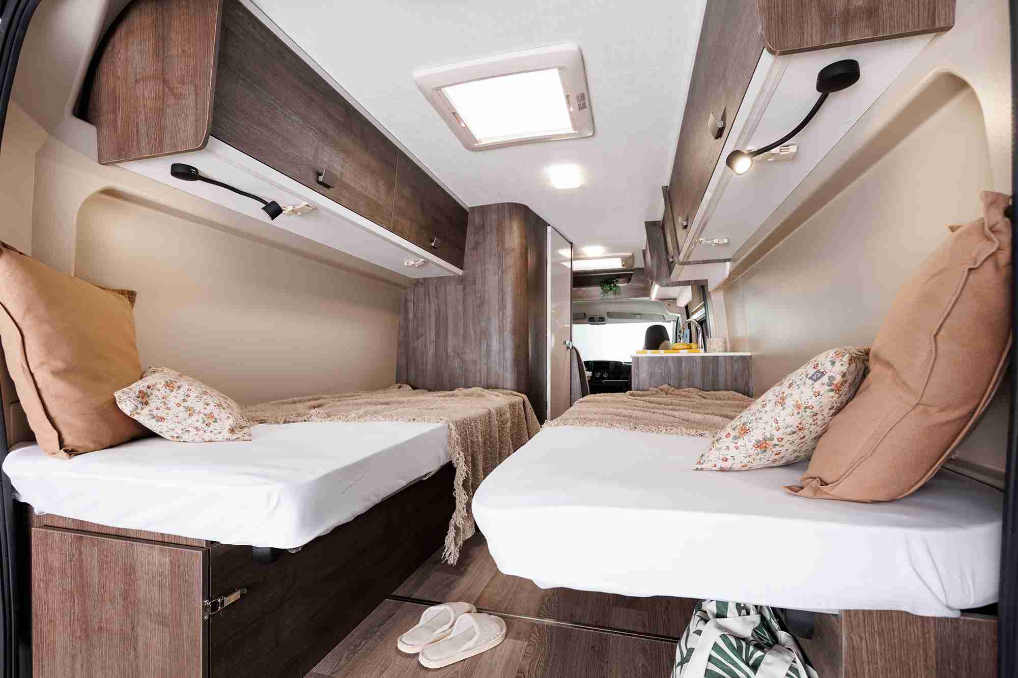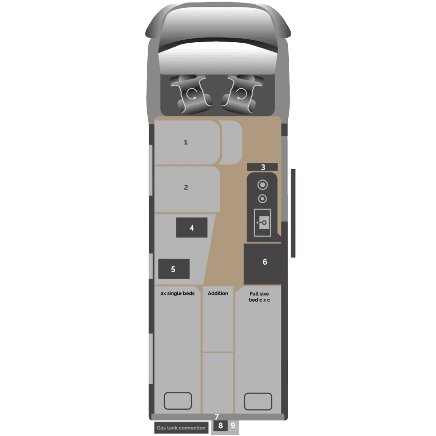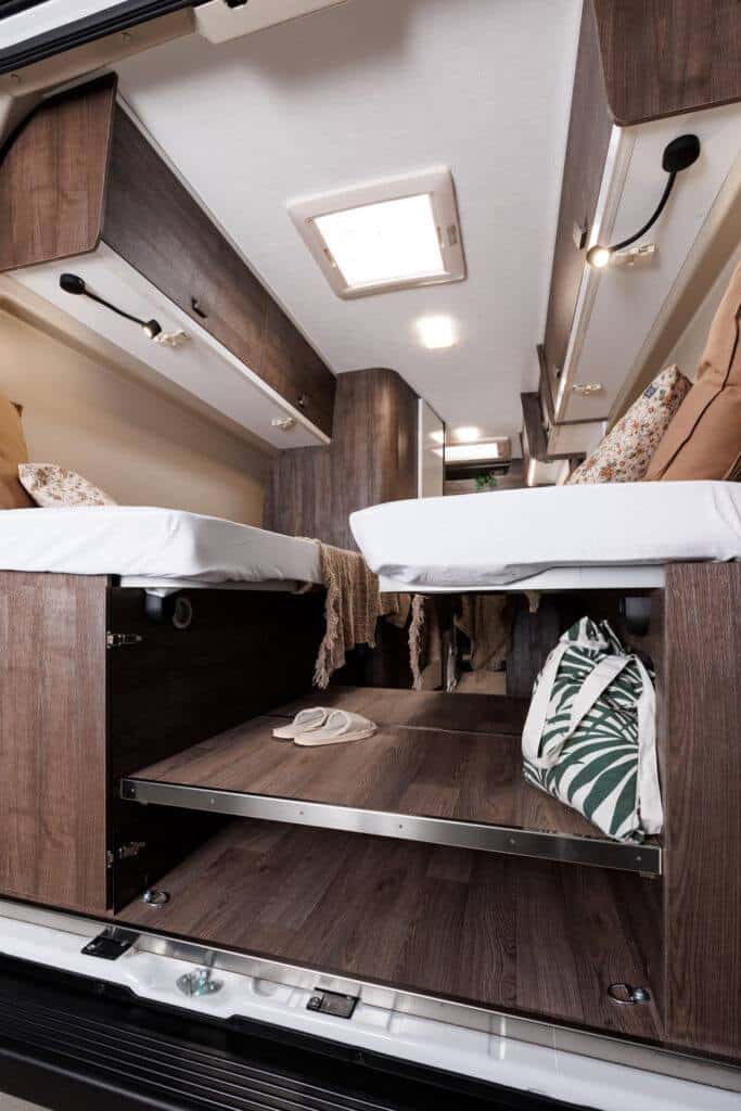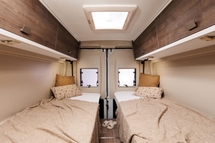 Motorhome 3 has seating for four and can sleep three comfortably—ideally, two adults traveling with a child. In the back of the van, there are two twin beds (80×195cm and 80×186cm) and an extension for the middle (50×188cm) creating one large bed. The van has a small kitchen setup with storage, a gas stove, a sink, and a 70l fridge. Motorhome 3 has a seating area with an extendable table to eat. Inside the van is a lavatory with a toilet for emergencies and a small shower.