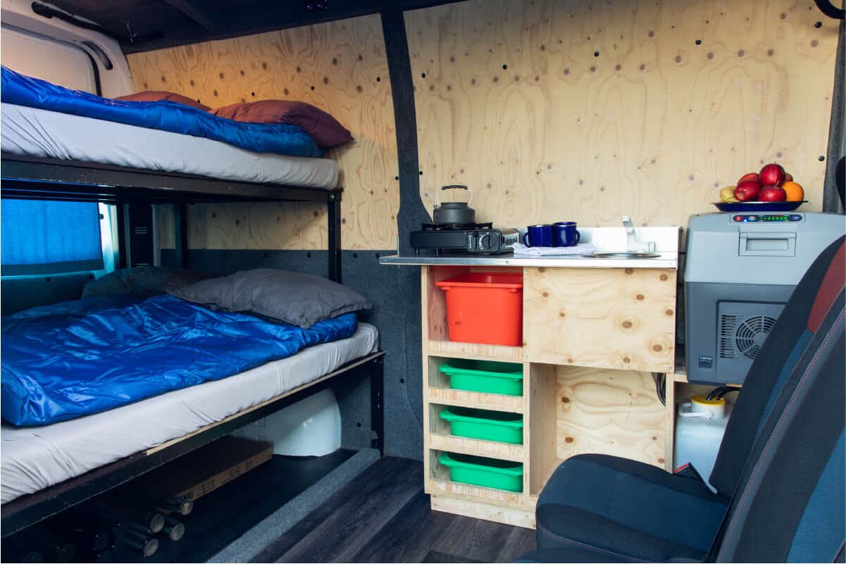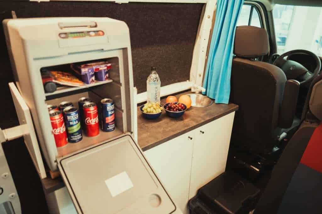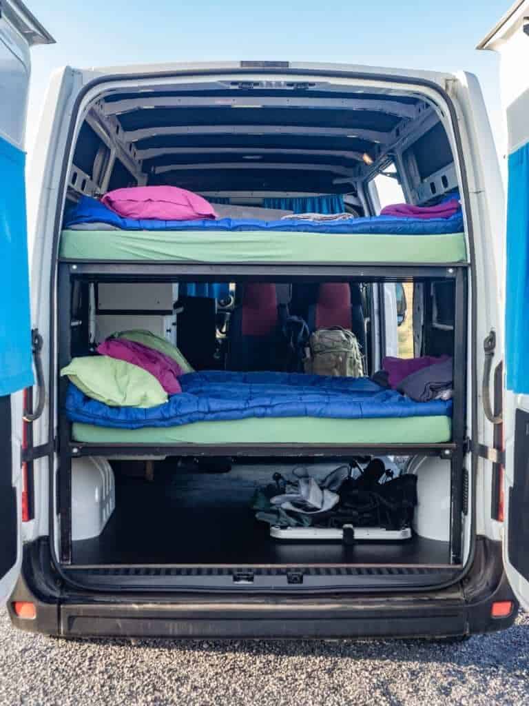 This campervan is one of the larger campervans we offer. The Renault Master is an experienced, smart, economical, and affordable option for larger groups. All our Renault Master campers have a manual transmission and drive very well, with seats for three in the front and two in the back. It can comfortably seat four to five people. Inside there are two bunkbeds, with space for three on the bottom and two on top. This camper has a functional kitchen area including enough storage for groceries, a sink, and a fridge. The Master 5 is fully equipped with all the essentials needed for a comfortable camping trip. In the camper, there is 12V electricity that allows for the charging of mobile devices and a built-in heating system that will keep everybody warm. The camper is spacious and is ideal for families.